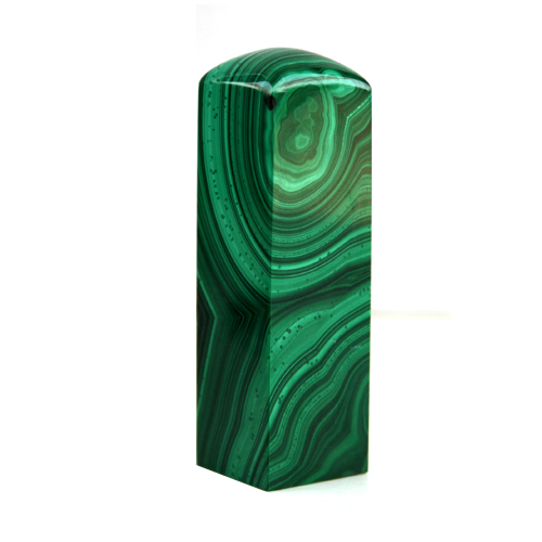 打磨成的印章,自然清新,味意雋永,間或柳葉彎眉,又似清晨露滴。氣質(zhì)獨特,高貴典雅,為印章藝術(shù)的奇葩;天生麗質(zhì),精美絕倫,色彩艷麗,紋理細膩,屬孔雀石上品,可謂“印章皇后”。孔雀石的英文名稱為Malachite,來自希臘語Mallache,指一種叫錦葵(Mallows)的植物,意思是“綠色”,以象征孔雀石的顏色??兹甘捎陬伾崴瓶兹赣鹈暇G色的斑點而獲得如此美麗的名字。