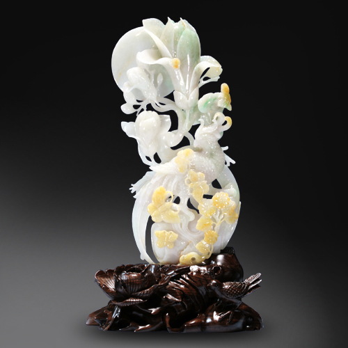 大塊天然翡翠原料以圓雕、鏤雕技法雕琢,一輪朝陽(yáng)冉冉升起,富貴花兒盛開,美麗的鳳凰俏立枝頭,名為“丹鳳朝陽(yáng)”,吉祥喜慶,讓人十分喜愛。