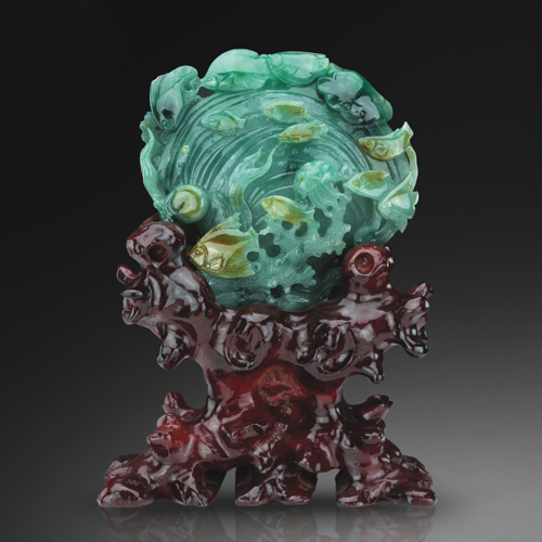 綠色充滿生機(jī),俏色雕琢精巧,栩栩如生,極具動(dòng)感。