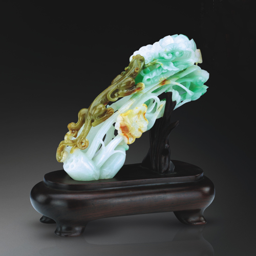 三彩翡翠玉料,質(zhì)地細潤,色彩強烈,以分色技法精雕。